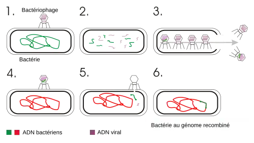 Le bactériophage infecte une première bactérie (bactérie donneuse) et y injecte son ADN viral à travers la paroi de la cellule. De nouveaux phages s'y développent, et certains intègrent une partie du génome bactérien dans leur capside de phage. Lors de la libération des phages, ceux-ci vont infecter d'autres bactéries. Les virus comportant une partie d'ADN bactérien vont l'injecter dans une nouvelle bactérie (bactérie receveuse).