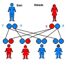 • toutes les filles seront malades, car leur père leur transmet obligatoirement le X, porteur de la maladie.