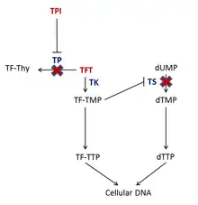 Le médicament est composé de la cytotoxine trifluridine et du tipiracil, inhibiteur de la thymidine phosphorylase (TPI)[3]. La trifluridine est incorporée dans l'ADN lors de la synthèse de l'ADN et inhibe la croissance des cellules tumorales. La trifluridine (TFT) est incorporée dans l'ADN par phosphorylation par la thymidylate kinase (TK) en TF-TMP[4] ; TF-TMP se lie ensuite de manière covalente à la tyrosine 146 du site actif de la thymidylate synthase (TS), inhibant l'activité de l'enzyme[4]. La TS est vitale pour la synthèse de l'ADN car c'est une enzyme impliquée dans la synthèse du désoxynucléotide thymidine triphosphate (dTTP)[4]. L'inhibition de TS épuise la cellule de dTTP et provoque une accumulation de désoxyuridine monophosphate (dUMP), ce qui augmente la probabilité que l'uracile soit mal incorporé dans l'ADN[4]. De plus, les phosphorylations ultérieures de TF-TMP provoquent une augmentation de la concentration de TF-TTP dans la cellule, ce qui entraîne son incorporation dans l'ADN[4]. Même si le mécanisme exact de la façon dont TFT provoque des dommages à l'ADN n'est pas complètement compris, on émet l'hypothèse que l'incorporation de TF-TTP dans l'ADN conduit à la formation de ruptures de brins d'ADN[4].