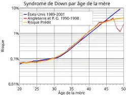 La trisomie 21 (ou syndrome de Down) est une anomalie chromosomique congénitale provoquée par la présence d'un chromosome surnuméraire pour la 21e paire. Ses signes cliniques sont très nets, un retard cognitif est observé, associé à des modifications morphologiques particulières. C'est l'anomalie chromosomique la plus commune avec, aux États-Unis en 1996, une prévalence de 9,2 pour 10 000 naissances vivantes[1]. L'incidence est d'environ 1 pour 770 naissances[2], toutes grossesses confondues, et varie en fonction de l'âge de la mère (seul facteur de risque connu à ce jour, les mères plus âgées ayant plus souvent des enfants porteurs) : environ 1/1 500 à 20 ans, 1/900 à 30 ans et 1/100 à 40 ans[3].