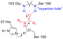 De plus, la trypsine contient un « trou oxyanion » bordé par les groupements amides du squelette polypeptidique au niveau de la glycine 193 et de la serine 195. Cette cavité accueille l'atome d'oxygène du groupement carbonyle de la liaison peptique clivée et stabilise l'intermédiaire de réaction en favorisant la formation d'une charge négative sur l'oxygène.