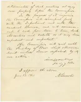 Alors que le travail de la Commission commençait à porter ses fruits et à être reconnu, ses relations avec les services du Surgeon general continuaient à être tendues, à tel point que, le , elle vota une motion, amplement justifiée par son immobilisme, exigeant son départ et son remplacement. La Commission demanda en outre que le général commandant l'armée du Potomac puisse choisir son propre directeur médical et qu'il lui rapporte directement, que soit créé au plus vite un « régiment d'ambulances » et que l'armée puisse s'adjoindre les services d'un nombre plus important d'infirmiers « hommes et femmes »[12]. Une fois de plus, les recommandations de la Commission restèrent lettre morte et « elle dut, le cœur lourd mais avec un courage intact, poursuivre sa tâche ingrate dans l'ombre froide de la négligence et de l'indifférence du Gouvernement[13]».