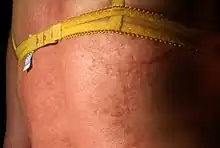 - Le dermographisme : il s’agit d’une urticaire qui apparait sur une zone de peau soumise à un simple frottement, des vêtements serrés, une épilation électrique, etc. Les plaques retracent alors le trajet de la friction.
