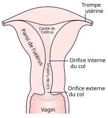 Ses dimensions sont de 6 à 8 cm de long par cm environ de large au niveau du corps et son épaisseur varie de 2 à cm. Il est aplati d'avant en arrière. Le corps est grossièrement triangulaire. La partie postéro-supérieure du corps reçoit l'implantation des trompes utérines. Le corps utérin est séparé du col par un isthme[3]. Le col est un cylindre autour duquel s'insère le vagin (la partie qui fait saillie dans le vagin est décrite en museau de tanche)[4].