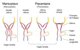- soit une conformation utérine normale chez certaines espèces : de nombreux mammifères, comme la souris, présentent de manière normale un utérus bifide (ce qui permet le développement simultané de nombreux embryons) ;