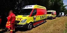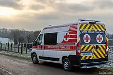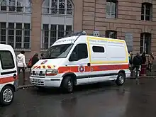 - ↑ Véhicule de transport sanitaire terrestre type B ; voir Arrêté du 28 août 2009 modifiant l'arrêté du 10 février 2009 fixant les conditions exigées pour les véhicules et les installations matérielles affectées aux transports sanitaires terrestres PDF avec annexes, faisant référence à la norme NF EN 1789 et à son guide d'application GA64-022 « Guide d’application de la norme NF EN 1789 »