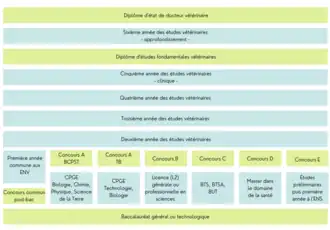 Schéma des études vétérinaires en France. Attention, la hauteur des cases n'est pas proportionnelle à la durée des études[29].