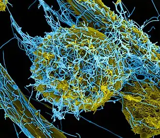 Le virus Ebola est un virus enveloppé à ARN simple brin de polarité négative appartenant à la famille des Filoviridae. Il cause des fièvres hémorragiques souvent mortelles, principalement dans certaines régions d’Afrique. Il infecte principalement les primates non humains et humains et pourrait éventuellement être utilisé dans des actes de bioterrorisme[1].