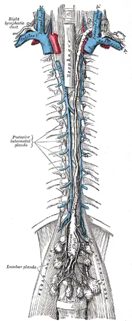 - le canal thoracique. Mesurant 40 cm, il recueille la lymphe du restant du corps : membres inférieurs, pelvis, abdomen ainsi que le quart supérieur gauche du corps. Il naît dans l'abdomen par un renflement, la citerne du chyle, traverse le thorax et vient se jeter à la base du cou dans la veine sous-clavière gauche.