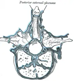 Coupe transverse d'une vertèbre thoracique. Les veines intervertébrales sont visibles derrière les processus transverses.