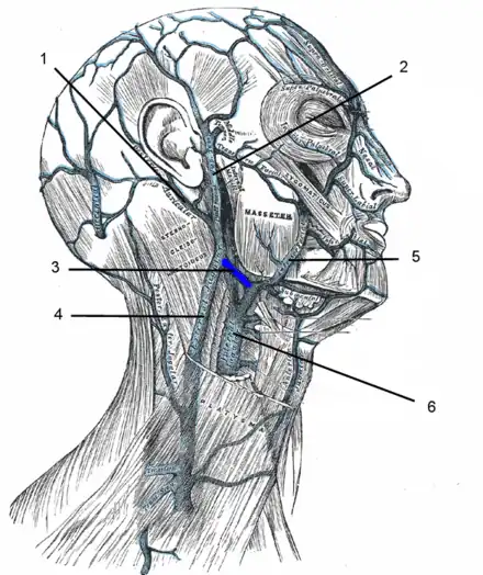 La veine rétro-mandibulaire (V. retromandibularis ou Veine communicante intra-parotidienne) est une veine de la tête et du cou. Parfois divisée en branche antérieure et postérieure[1], elle sert d'anastomose entre les systèmes jugulaire interne et jugulaire externe. Véritable carrefour, elle draine l'origine de la veine jugulaire externe, issue de la réunion des veines temporales superficielles, veines maxillaires et celles de la région rétro-auriculaire[2] à la veine jugulaire interne via le tronc commun (avec la veine faciale, veine linguale et parfois la veine thyroïdienne supérieure ou tronc thyro-linguo-facial de Farabeuf)[2], ou via la veine faciale soit plus rarement directement dans la jugulaire interne.