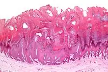 Le caractère principal retrouvé en histologie est une vacuolisation des kératinocytes de la couche granuleuse et des couches supérieures de l'épiderme. On note des inclusions basophiles composées par les particules virales et des inclusions éosinophiles contenant une kératine anormale[2].