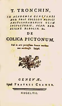 Il fallut pourtant attendre 1473 pour dénoncer les dangers du « chaulage du vin ». Ce fut Nicolas Ellembourg, moine de l'abbaye bénédictine d'Ottobeuren qui fit cette relation[35]. Puis au siècle suivant, Jacques Auguste de Thou décrivit pour la première fois les symptômes de l'empoisonnement : « Dès qu'un homme est attaqué, son corps devient comme paralytique : il a le visage pâle, l'esprit inquiet, des maux de cœur, des vomissements, un hoquet continuel, une soif ardente, une difficulté d'uriner, une douleur violente dans l'estomac, les intestins, les hypocondres, les reins ; il y en a même dont les pieds, les jambes & les mains deviennent paralytiques, après avoir été attaqués de convulsions épileptiques. »[39]. Ce fut François Citois, originaire de Poitiers et médecin du cardinal de Richelieu, qui lui donna le nom de colica pictonum, dans son traité De novo et populari apud Pictones doloro colica bilioso diatriba[35].