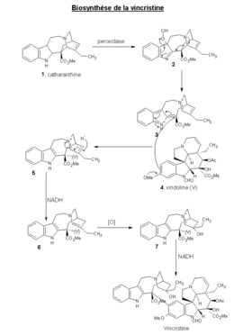 Premièrement, il y a oxydation de la catharanthine (1) à l'aide d'une peroxydase, un peroxyde (2) étant alors formé. À la suite d'un réarrangement et de l'élimination d'un hydroperoxyle HO2, la liaison entre les deux atomes de carbone est rompue ; on obtient un dication intermédiaire (3). Celui-ci va être attaqué par la vindoline (4), qui est un nucléophile par substitution électrophile aromatique. Le produit de cette réaction (5) est réduit par le NADH pour donner le cycle dihydropyridinium (6). L'étape suivante correspond à une hydroxylation. Pour finir, il y a réduction par NADH qui réduit spécifiquement l'ammonium en amine tertiaire.On obtient ainsi la vincristine.