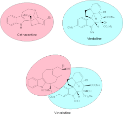 La vincristine dérive d'un couplage entre deux alcaloïdes: la catharanthine et la vindoline, tous deux présents dans la pervenche de Madagascar mais en concentration plus importante que la vincristine. En effet, 1 kg de feuilles séchées de pervenche contient seulement 10 mg de vincristine contre 1 g/kg pour la vindoline et 300 mg/kg pour la catharanthine. On utilise donc préférentiellement[3] le couplage lors de la biosynthèse et de la synthèse de la vincristine, le but étant d'obtenir le meilleur rendement. Ces deux procédés sont assez similaires.