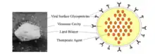 Un virosome est une vésicule constituée d'une membrane phospholipidique simple, mono- ou bicouche, incorporant des protéines dérivées de certains virus destinées à permettre la fusion de cette vésicule avec la membrane plasmique de cellules cibles. Cette technique a été publiée pour la première fois en 1975 à partir de virus de la grippe[1] (influenza). Dépourvus de matériel génétique, les virosomes sont incapables de se reproduire, et sont simplement en mesure de pénétrer dans les cellules de la même façon que les virus dont sont issues les protéines incluses dans leur membrane[2]. Ces propriétés permettent d'envisager de les utiliser comme transporteurs de médicaments, à l'instar des liposomes.