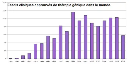 La thérapie génique est évoqué dès la fin des années 1960[15] se concrétise par des essais prometteurs à la fin des années 1980 puis par de premiers succès (chez des enfants-bulles) dans les années 2000, avec toutefois des effets secondaires graves, mais continue à se développer[16]. Près de 2 000 essais cliniques auraient été proposés dans le monde en 2013[17], souvent contre le cancer.