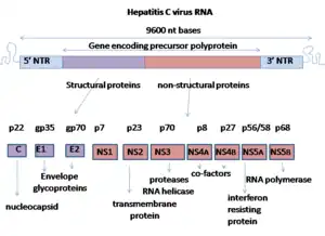 • Les protéines structurales comportent la capside et les deux glycoprotéines d’enveloppe (E1 et E2)[3]. Il existe aussi une protéine appelée protéine p7 qui semble jouer un rôle essentiel dans la morphogenèse du virus[10].