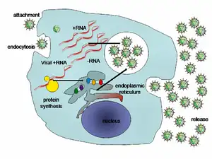 Une fois la reconnaissance entre la particule virale et son récepteur établie, il y a fusion entre l’enveloppe virale et la membrane cellulaire à pH acide, induisant un changement de conformation de l’enveloppe virale, la décapsidation de la particule virale, et la libération de l’ARN positif du génome viral.