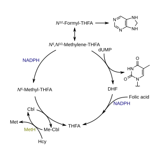La méthylcobalamine est le coenzyme de la méthionine synthase pour la méthylation de l'homocystéine en méthionine. Le groupement méthyl est apporté par le 5-méthyl-tétrahydrofolate (5-CH3-THF) ce qui permet la régénération du tétrahydrofolate (THF), indispensable à la synthèse du thymidilate[14]. Donc, de façon indirecte, la méthylcobalamine joue aussi un rôle dans la synthèse de la thymidine (substance importante pour le métabolisme des nucléotides).