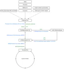 Un déficit en adénosylcobalamine induit de ce fait une accumulation d'acide méthylmalonique (précurseur du méthymalonyl-CoA)[14],[33].