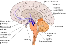 La voie mésolimbique est un ensemble de neurones dopaminergiques (c'est-à-dire libérant de la dopamine) qui se projettent de l'aire tegmentale ventrale (ATV) vers le striatum ventral, qui comprend le noyau accumbens (NAcc) et le tubercule olfactif[10]. C'est l'une des voies composantes du faisceau médial du prosencéphale, qui est un ensemble de voies neuronales qui assurent la stimulation cérébrale et la récompense[11].